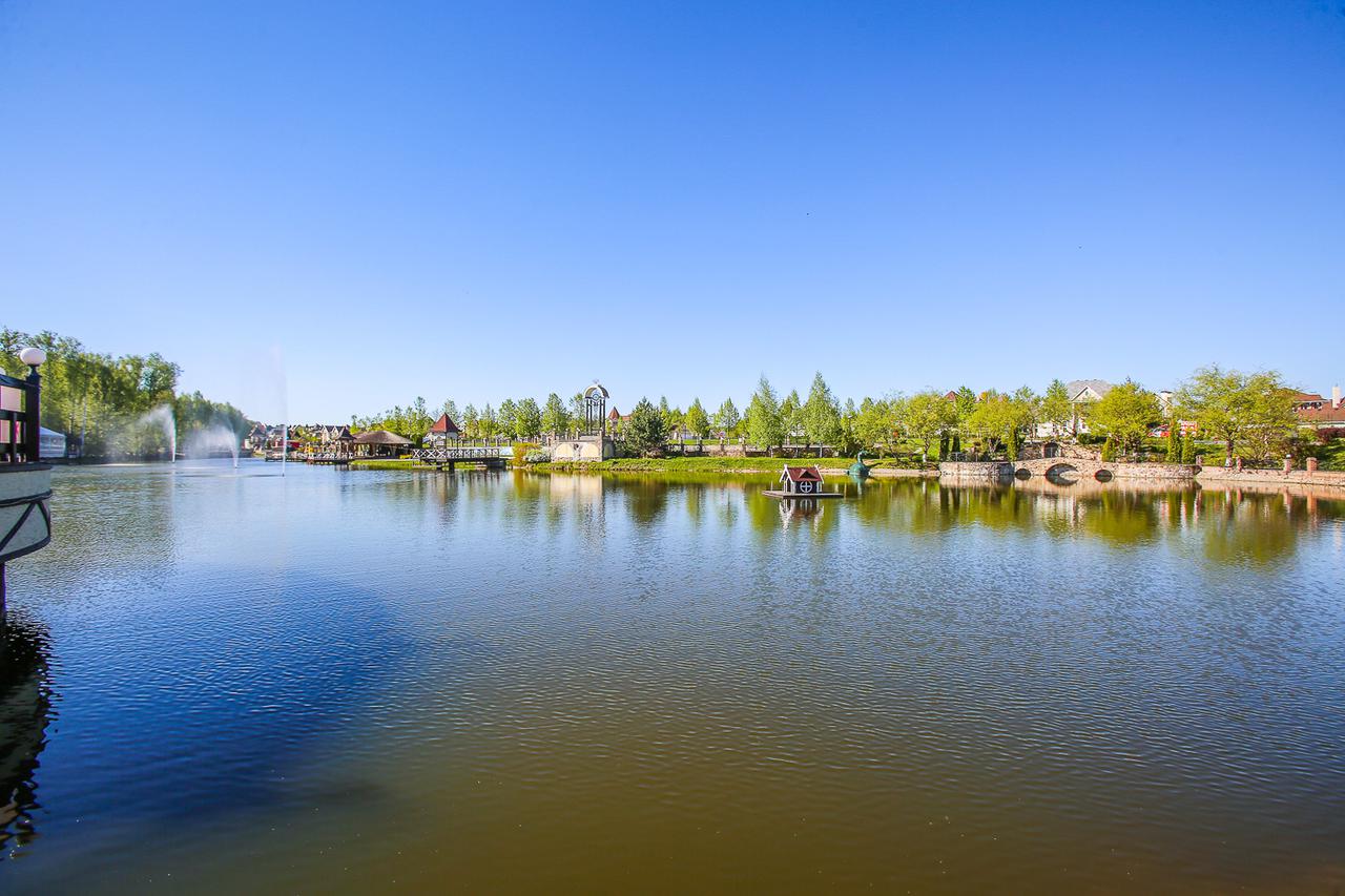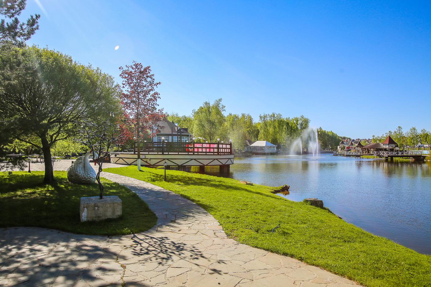 Участки обрамлены коваными ограждениями, улицы освещены торшерами, тротуары выложены плиткой. Общественные пространства отделаны качественно, без экономии на материалах. Но главное — это парковая композиция. Девять гектаров зелени разделены на три тематические зоны: «Озерная группа», «Графские пруды» и «Парк смены эпох». В последнем установлены декоративные элементы разных исторических периодов — каменный круг-кромлех, стилизованный колизей, водяная мельница и замок. Это не просто украшения, а попытка создать ощущение путешествия во времени.