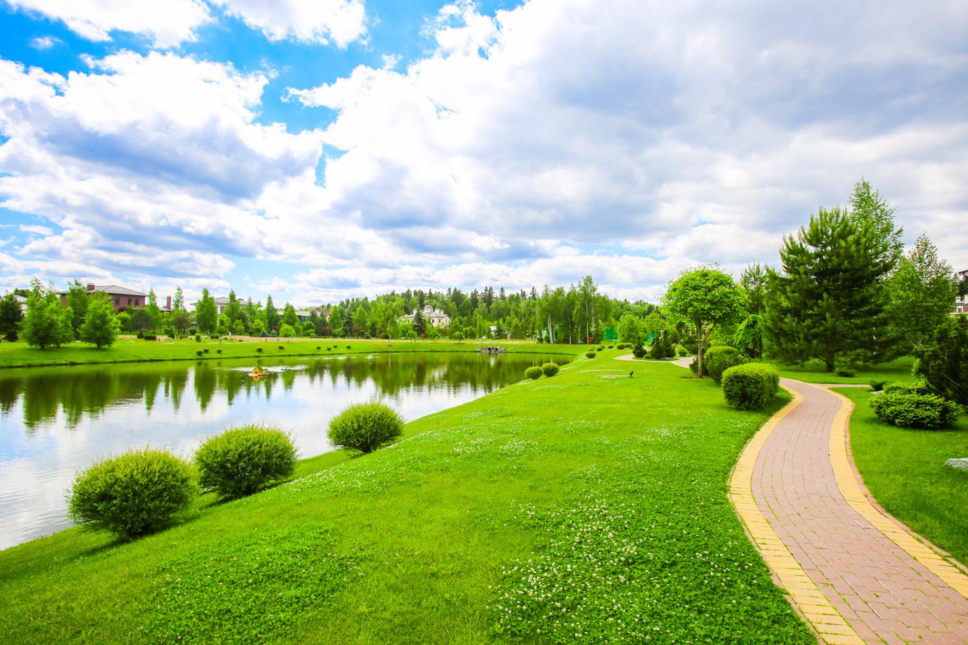 Двадцать процентов территории поселка — общественный парк. В центре — озеро с пляжем, пирсом и зонами отдыха. К нему ведет широкий бульвар с аллеями, скамейками, клумбами. Зимой на озере заливают каток. Вокруг — детские и спортивные площадки, воркаут, пляжный волейбол, беседки, мостики через ручей. Место, где можно гулять, не выходя за пределы поселка.