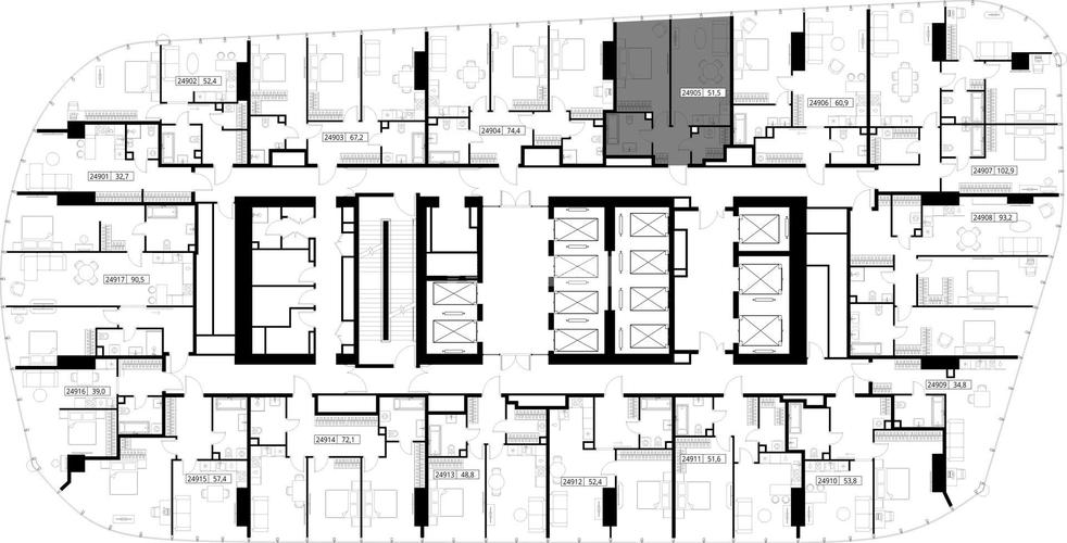 Всего в проекте 81 апартамент на 6 этажах. Площадь варьируется от 45 до 176 кв. м, а высота потолков от 3,2 до 7,6 м. Доступны резиденции с окнами, выходящими в тихий внутренний двор, и наоборот видовые апартаменты с тремя спальнями. На верхних этажах располагаются 11 двухуровневых пентхаусов с широкими террасами. Планировка свободная, с возможностью объединения как по горизонтали, так и по вертикали.