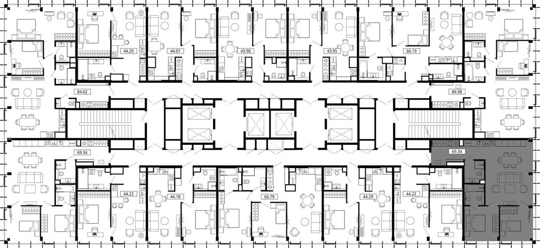Всего в клубном доме представлено 308 лотов: 304 апартамента площадью от 43 до 260 м², а также 4 пентхауса площадью 373 м². Благодаря большой площади остекления все помещения наполнены естественным светом. Высота потолков – от 3,05 м до 3,95 м. Одним из главных преимуществ проекта является разнообразие планировочных решений: квартирография предполагает 25 продуманных вариантов. Апартаменты в ЖК Скайвью передаются с отделкой White Box, что позволит будущим владельцам сформировать уникальное жизненное пространство, которое будет отвечать именно их образу жизни и характеру.