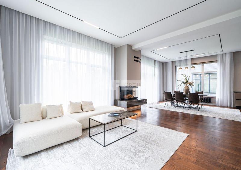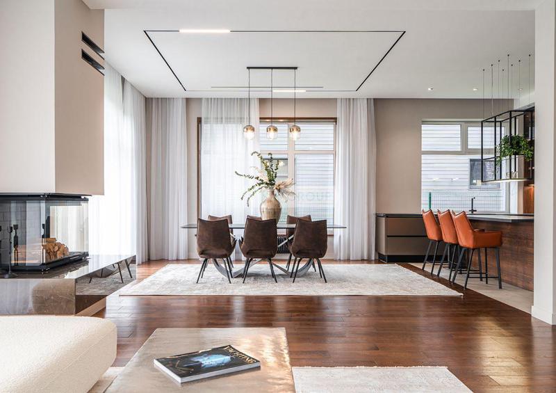 Стильный двухэтажный коттедж в современном стиле расположен в закрытом поселке «Крекшино». Фасады здания облицованы декоративной светло-бежевой и темно-шоколадной плиткой в сочетании с фасадной доской. Внутреннее пространство дома оформлено по индивидуальному дизайнерскому проекту. В отделке использовались натуральные материалы и высококачественные элементы декора. Доминантой интерьера выступает гостиная-столовая с камином и панорамными окнами от пола до потолка.