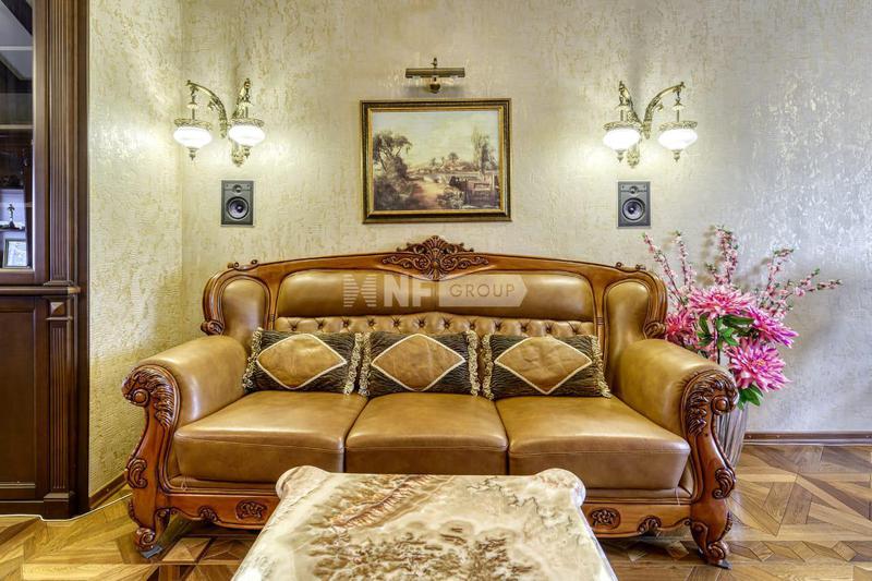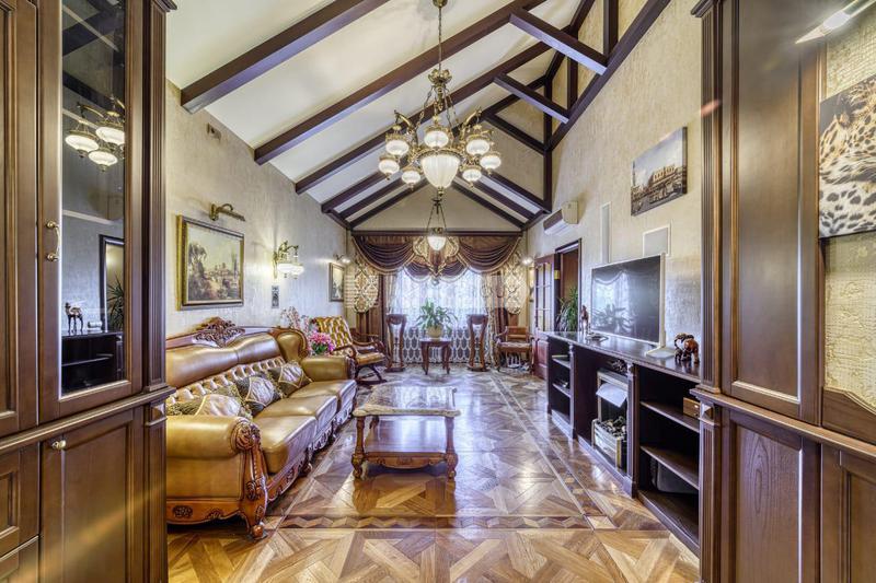 Вся мебель и предметы декора представлены известными производителями: люстра от "Anthologie Quartet", стол - "Ralph Lauren", кресло от "Henredon", стулья - "Andy Tornton", сервировочный столик - "Roche Bobois", диваны от "English Interiors".