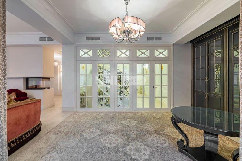 Первый этаж имеет общую площадь 285 м² (жилая — 229 м²) и включает навес и гараж на два автомобиля, бойлерную с отдельным входом, гардероб при прихожей, кухню с островом, просторную гостиную со вторым светом, столовую зону с панорамным остеклением, гостевую спальню с санузлом и гардеробной, а также просторную открытую террасу.