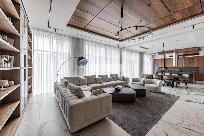 1 этаж: гостевой с/у, гостевая спальня со своим с/у и гардеробной, каминный зал и гостиная, кухня-столовая с верандой;